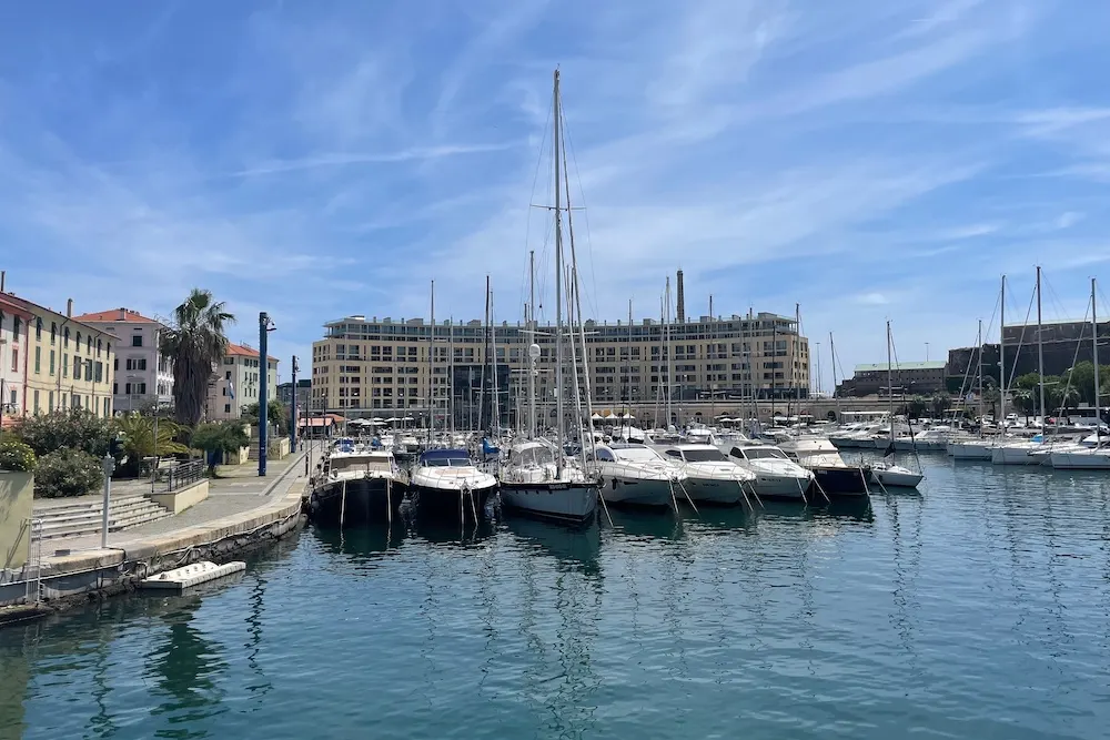 - De haven van Savona, met aan de ene kant zeilboten en verschillende restaurantjes met zicht op de boten; aan de andere kant meren reusachtige cruiseschepen aan.